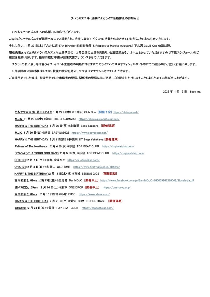 この度のクハラカズユキのライブ活動休止を受け、百々和宏と69ersの2/13(金)鹿児島bar MOJO、2/14(土)熊本ONE DROPの両公演を一旦中止とさせて頂きます。 ご予約を頂いていたお客様へはお店の方から個別にご連絡させて頂きます。 本人の回復状況を見守りつつ、夏以降で振替となる公演を行えたらと考えております。 なお、2/15(日)小倉FUSE公演はサポートドラムにアヒトイナザワを迎えて出演します。
